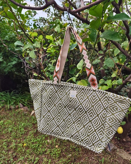 Pensé pour accompagner vos journées avec style, ce sac à main grand modèle en coton est entièrement fabriqué à la main à Antibes. Un accessoire unique qui conjugue légèreté, espace et douceur.